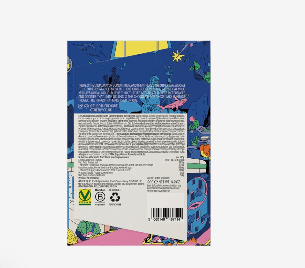 OTHERLY Birthday Cake Oatm*lk is a plant-based chocolate 43% cacao content made with fine flavour cocoa beans from Colombia and oat powder; Taking a bite, the chocolate yields with a satisfying snap, releasing a burst of flavors on your palate. The creamy, velvety texture of the oatm*lk chocolate envelops your taste buds, providing a luxurious mouthfeel that complements the sweetness perfectly. Within this harmonious blend, you encounter crunchy bits that add a delightful contrast to the smoothness. These are the cake-like components, woven into the chocolate, imitating the tender crumb of a birthday cake. Each nibble brings forth playful sensations, as a sensory celebration, delighting both the taste buds and the heart.